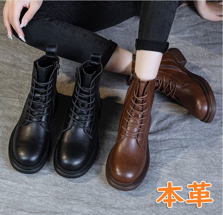 このショートブーツは、本革を使用した上質な素材感が魅力です。牛革ならではの柔らかさが足にフィットし、一日中履いても疲れにくい設計。サイドジッパーが付いているため、脱ぎ履きも簡単で、忙しい日常をサポートしてくれます。