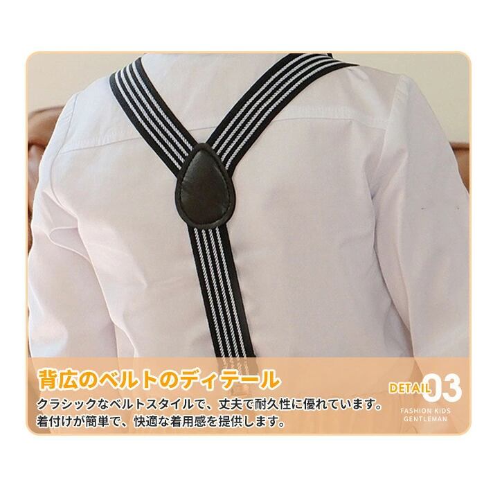 この男の子用スーツセットは、特別な日を華やかに彩るアイテムです。おしゃれなデザインにはサスペンダーが付いており、調節可能だから成長に合わせて長く愛用できます。誕生日、入学式、卒業式、結婚式やパーティーなど、どんなシーンでも主役にふさわしいスタイルを提供します。