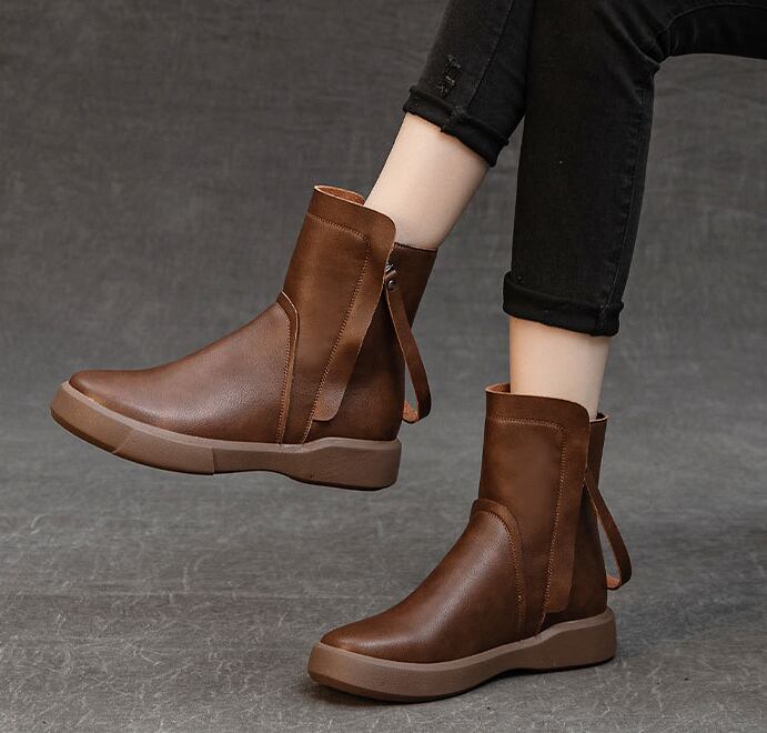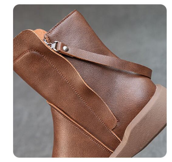このショートブーツは、上質な牛革を使用した洗練されたデザインが魅力で、秋冬のコーディネートにぴったりなアイテムです。ローヒール設計により、日常使いから特別なシーンまで幅広く活躍します。サイドジッパー付きで、脱ぎ履きも簡単。裏起毛の柔らかな素材感が心地よく、寒い季節でも安心しておしゃれを楽しめる一足です。