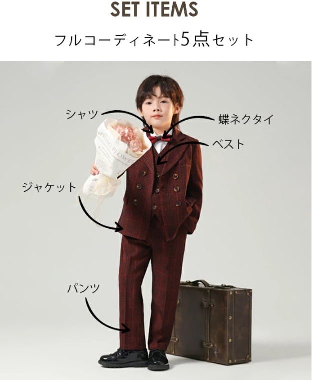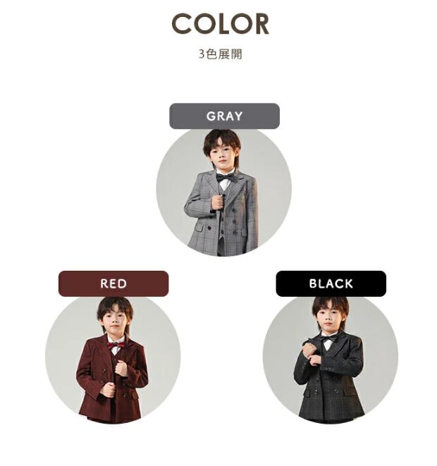 このスーツを選ぶことで、特別な日を素敵に演出することができるのは間違いありません。ぜひお子様の大切な瞬間にふさわしい一着として、取り入れていただきたいです!また、大きいサイズもご用意しておりますので、体型に合わせて安心してお使いいただけます!
