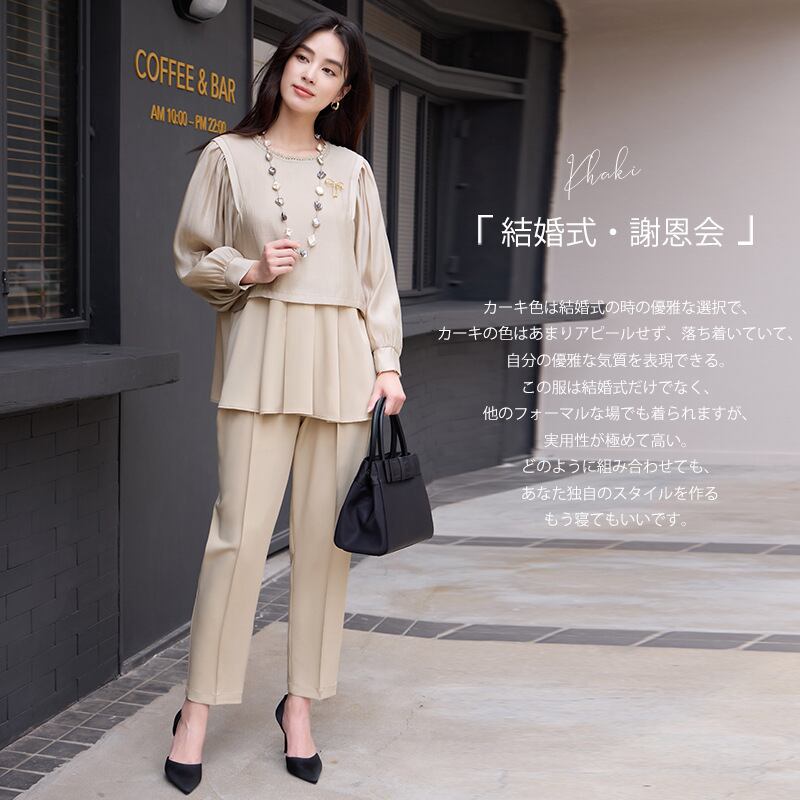 このパンツスーツは、入学式や卒業式、結婚式、七五三、通勤など、特別なシーンに最適なデザインが魅力です。20代から50代の女性の方々に向け、体型カバーを考慮したシルエットを採用しているため、安心して着用していただけます。上品で落ち着いたカラーリングが、フォーマルな場面での存在感を引き立てます。