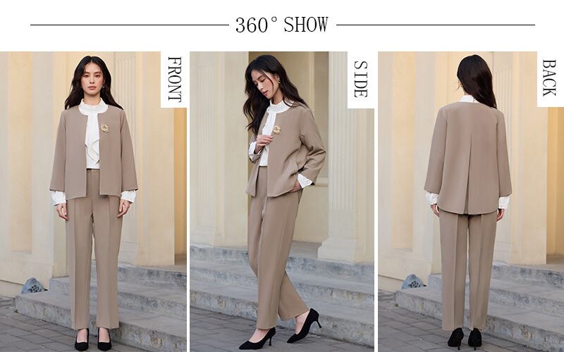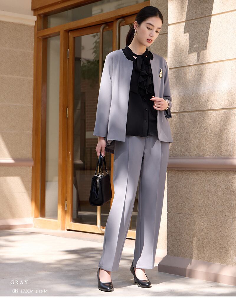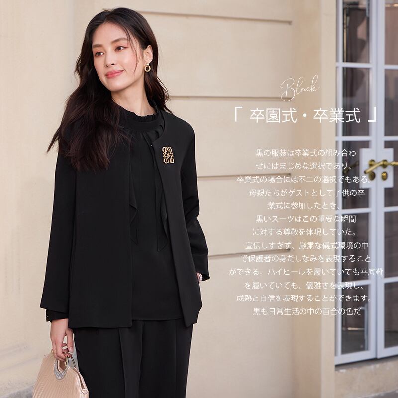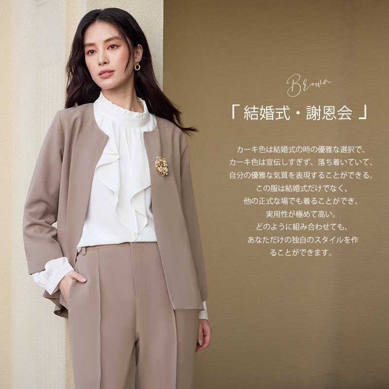 このスーツは、入学式や卒業式、母親の役割を果たす特別な日、さらには卒園式に最適なデザインが魅力です。30代から60代までの女性に向けて、体型を優しくカバーするシルエットを採用しており、シーンを選ばず安心しておしゃれを楽しむことができます。落ち着いたカラーリングが、フォーマルな場面において華やかさを添えます。