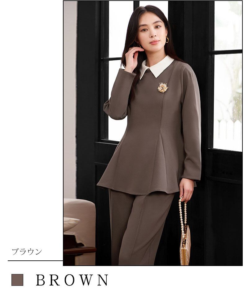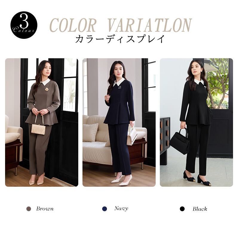 このレディースパンツスーツは、入学式、卒業式、卒園式、オフィス面接など、特別なセレモニーやビジネスシーンに最適なデザインが魅力です。特にママや母の方々を意識したシルエットは、体型を優しくカバーし、自信を持って着こなせるスタイルを実現します。落ち着いたカラーリングは、どんなフォーマルな場面でも洗練された印象を与えます。