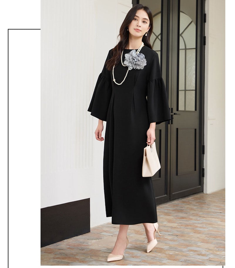 このロングワンピースは、入学式、卒業式、入園式、そして結婚式やお宮参り、七五三などの特別なイベントに最適なデザインが魅力です。特にママや母の方々を意識したシルエットは、体型を美しくカバーし、自信を持って着用できるスタイルを提供します。シックな黒のカラーリングは、フォーマルな場面で常に上品な印象を与え、華やかさを演出します。