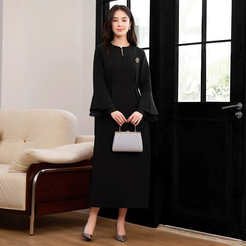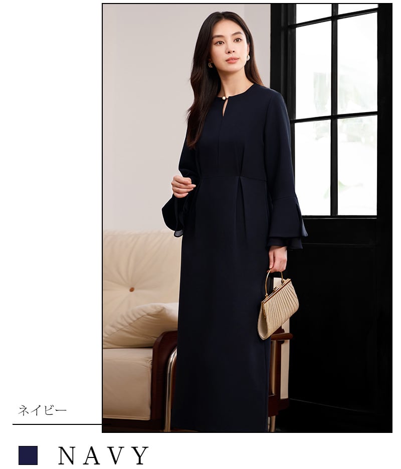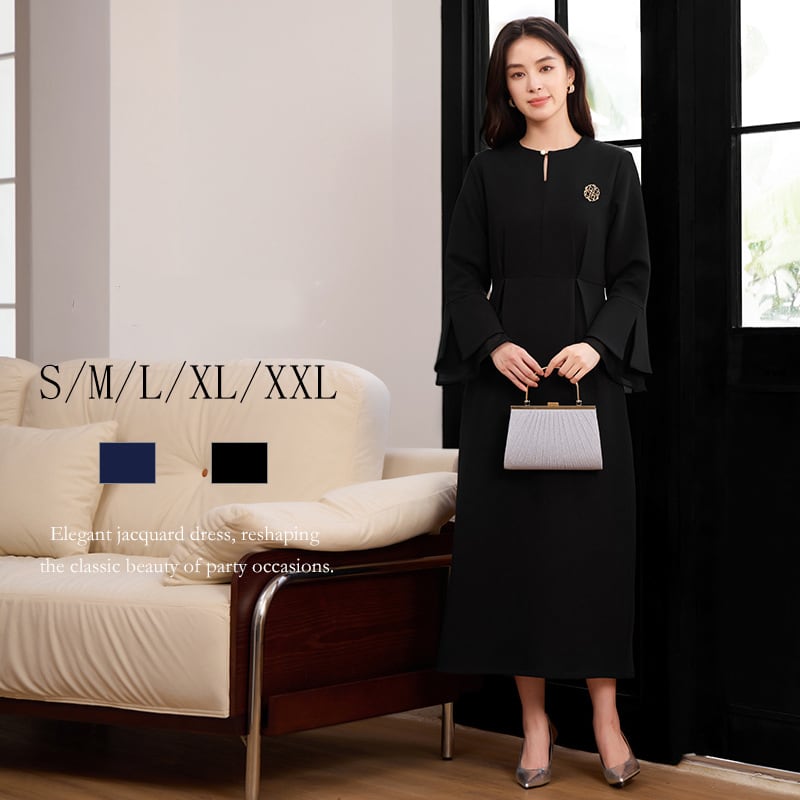 このロングワンピースは、入学式、卒業式、入園式などの特別なシーンから、日常のカジュアルなお出かけまで幅広く対応できるデザインが魅力です。特に、ママや母の方々を意識したゆったりとしたシルエットは、体型を自然にカバーし、自信を持って着用できるスタイルを提供します。シックな黒のカラーリングは、フォーマルな場面においても常に上品で洗練された印象を与え、華やかさを演出します。
