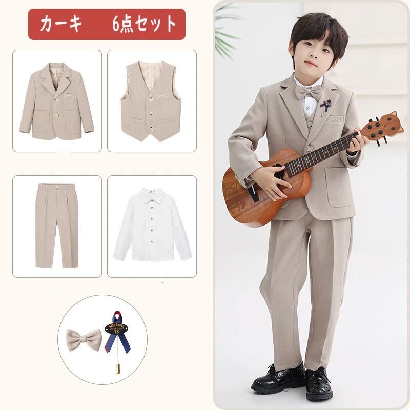 この魅力的なスーツは、入学式、卒業式、入園式、卒園式、発表会、結婚式、七五三など、特別なシーンにぴったりのデザインが特徴です。90㎝から160㎝までサイズをご用意しており、成長に合わせて選べるのが嬉しいポイント!おしゃれな6点セットは、ジャケット、パンツ、シャツ、ネクタイ、ベスト、ブローチが揃っており、フォーマルな装いを一式整えることができます。