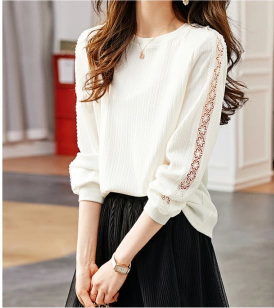 肩から袖にかけて透け感のある模様が入ったカットソー。
