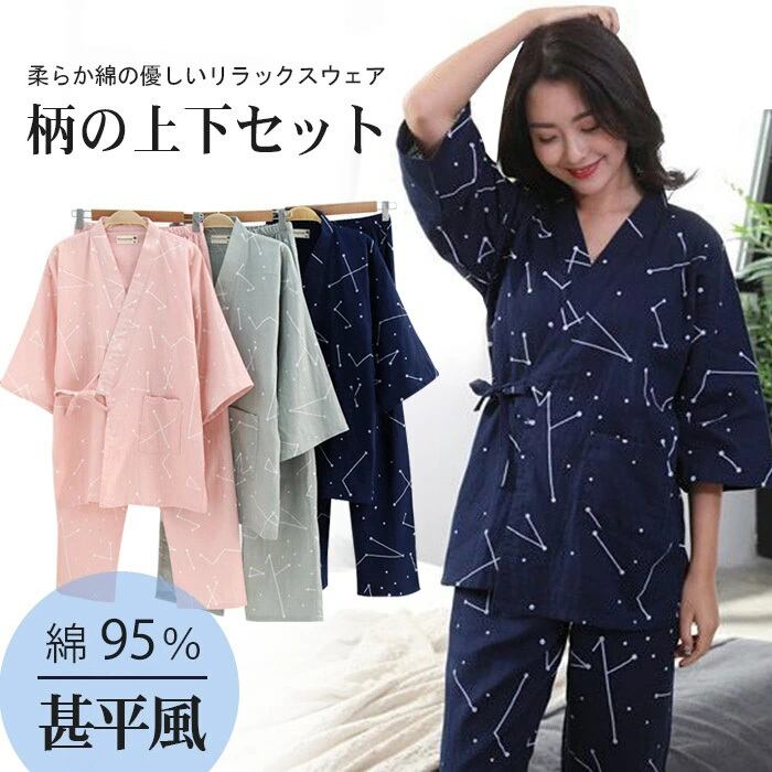 甚平 上下セット ルームウェア パジャマ ガーゼ 2点セット 便利服 寝巻き 浴衣 和風 七分袖 レディース メンズ 綿95% 長ズボンナイトウエア ゆったり 通気性抜群 前開き 部屋着 柔らかい 着心地いい 肌触り良い 浴衣柄 和風 春夏 秋冬 母の日 父の日 ギフト