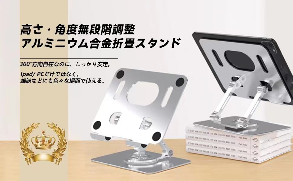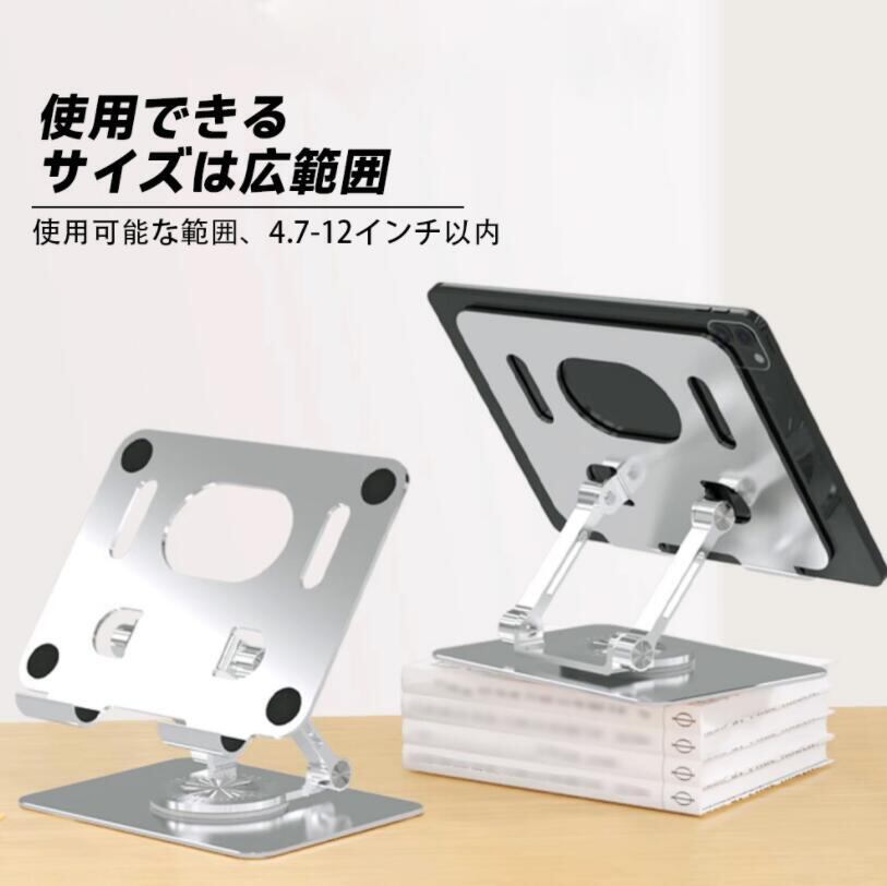 スマートなデザインと高い機能性を兼ね備えたタブレットスタンド。360度回転して角度や高さも自由自在に調整可能なので、快適な視聴や使用が可能です。アルミ製で軽量かつ頑丈なので、持ち運びにも最適。折りたたんでコンパクトに収納することもできます。iPhoneやスマホにも対応しており、卓上での使用も便利です。スマートフォンやタブレットを快適に使いたい方には必須のアイテムです。