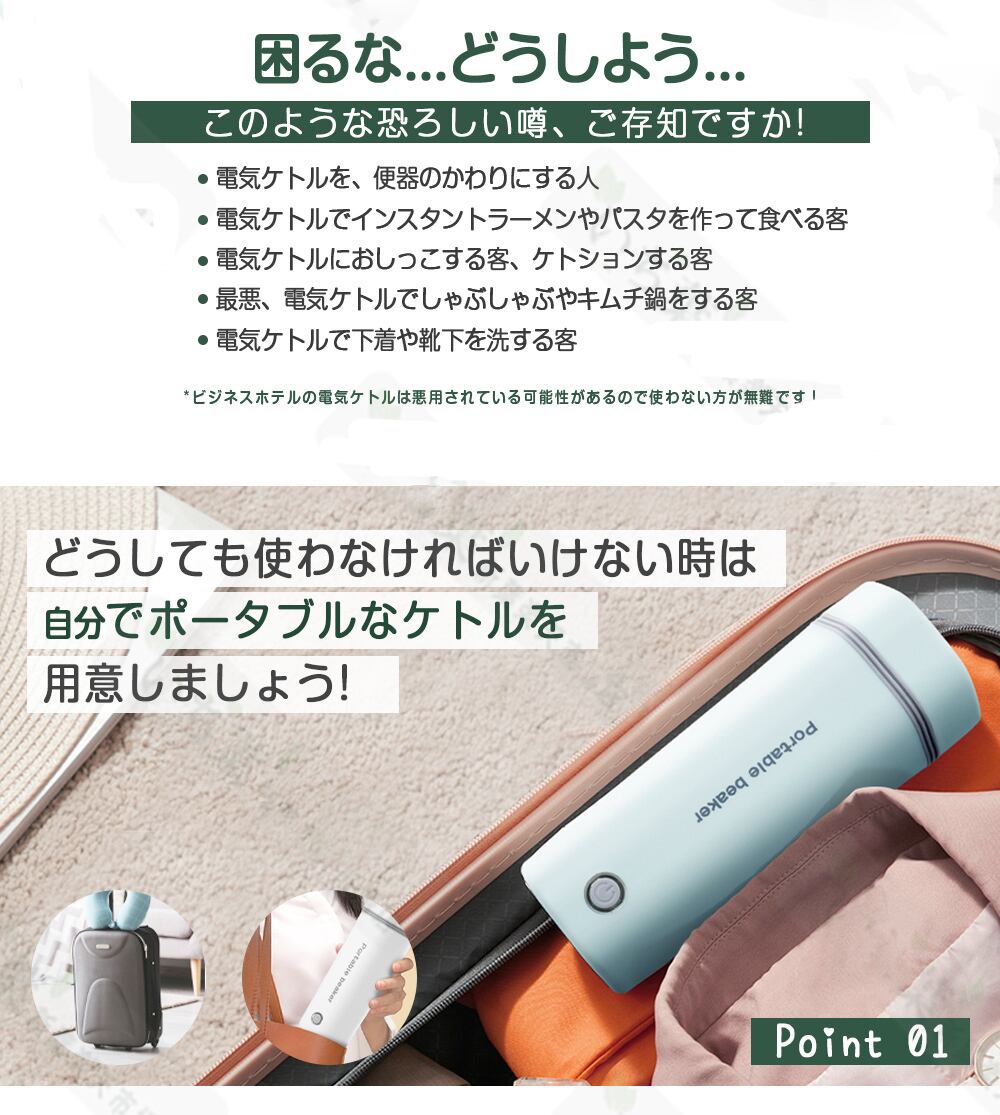 このポータブル電気ケトルを利用する時、ご注意ください