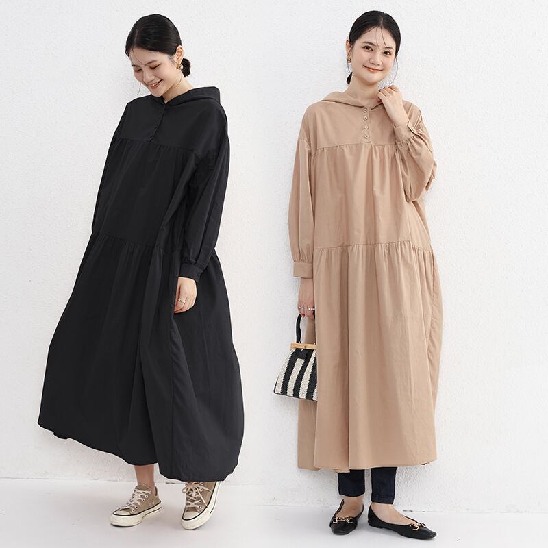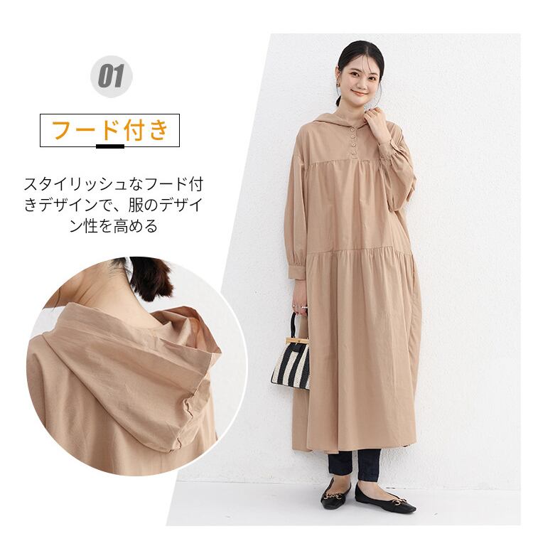 このワンピースは、忙しい朝でもラクに着られるシャツワンピースタイプ。ゆったりとしたサイズ感で、動きやすさも◎。マキシ丈で足元までしっかりとカバーしてくれるので、体型の気になる部分をカバーしながらもスタイルをより美しく見せます。羽織りものとしても活用できるので、さまざまなコーディネートにマッチします。