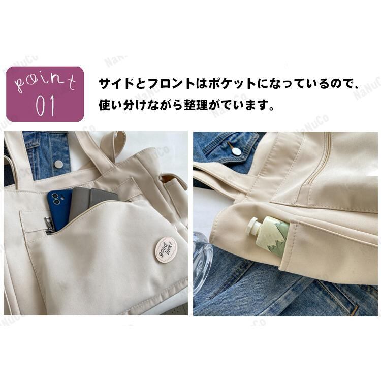 このトートバッグは、軽い素材で持ち運びも楽々。また、ショルダーとしても使えるので、手ぶらで動きたい時にも便利です。おしゃれなデザインと機能性を兼ね備えた、女性にうれしい一品です。