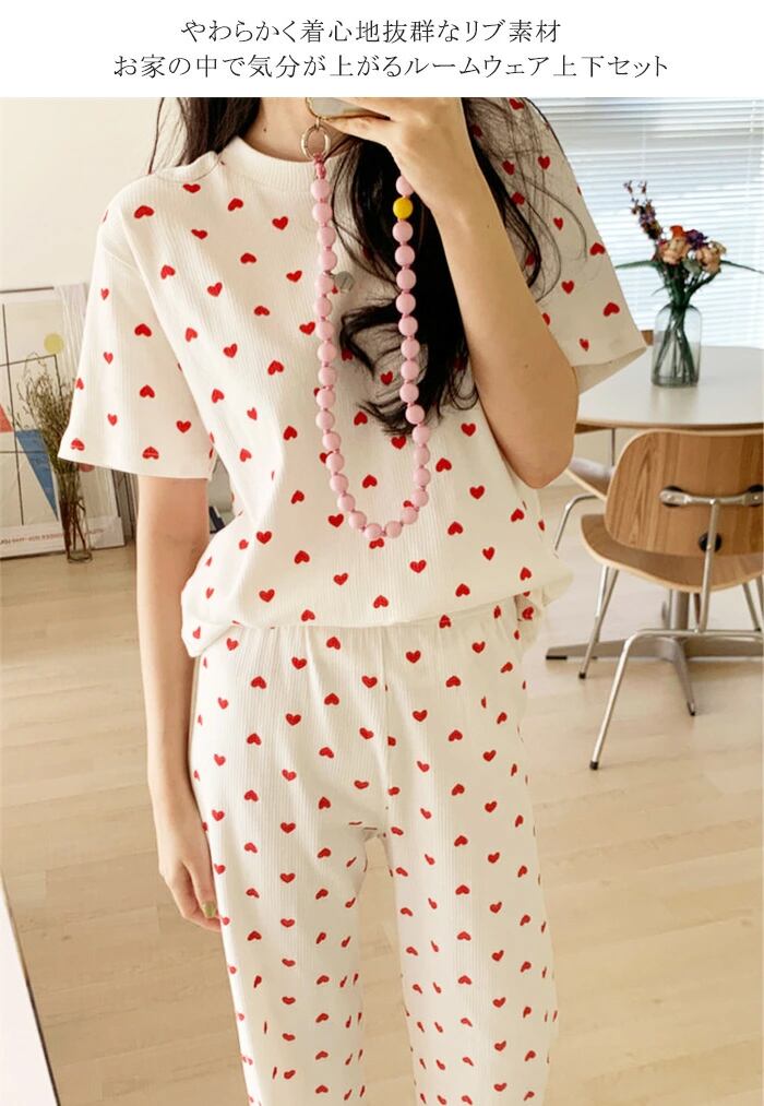 カワイイハート柄が印象的な、春夏にぴったりの半袖ルームウェアセットが登場しました。上下セットだから、おうち時間でもおしゃれを楽しめますよ。ついつい触れたくなるような柔らかな生地は、着心地も抜群です。