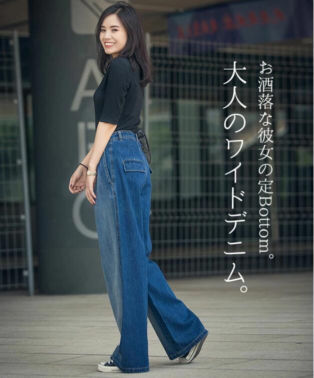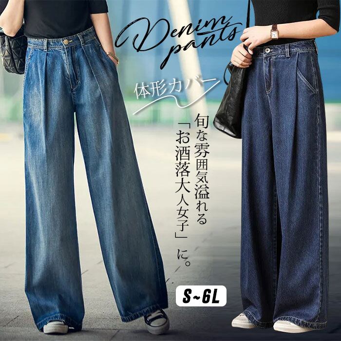 ハイウエストでウエストラインを美しく演出するデニムパンツ。ワイドなシルエットがゆるカジュアルな雰囲気を演出し、体型をカバーしてくれるので美脚効果も期待できます。ロング丈なので、足のラインも長く見せてくれます。ストレートなデザインで、様々なトップスとも合わせやすく、コーディネートの幅が広がります。