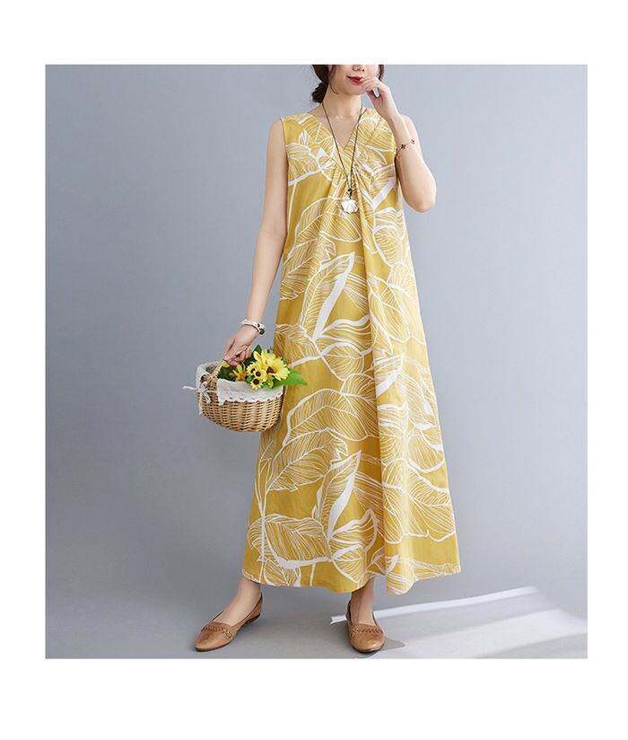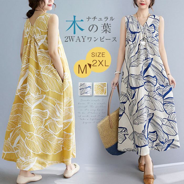ノースリーブのロングワンピースは、春の森ガールスタイルにぴったり。大きいサイズでゆったりとしたシルエットが体型をカバーし、着心地も抜群。フェミニンな花柄が女性らしさを際立たせ、スクエアネックとVネックが首元を美しく演出します。自然の中を歩くようなゆるやかな雰囲気を楽しめる、春のお出かけにぴったりな一着です。