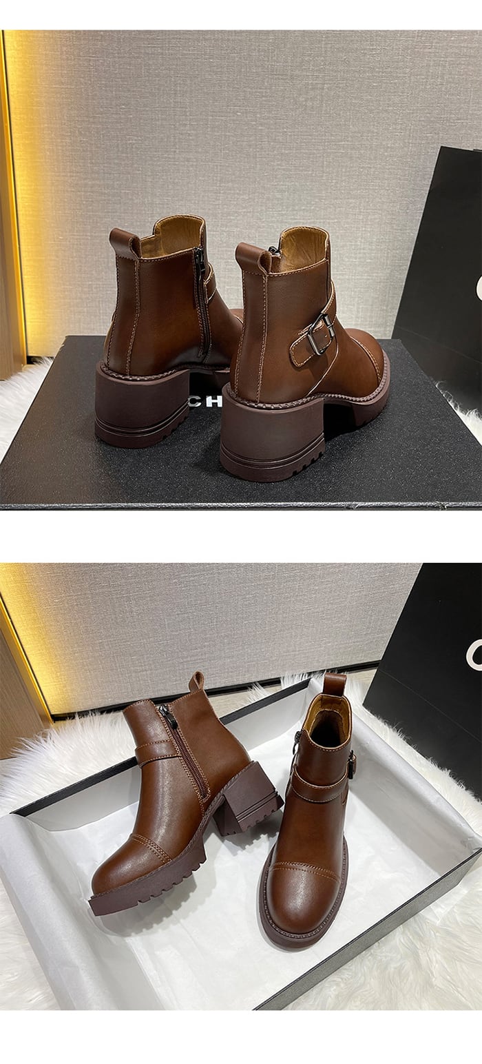 厚底太ヒールのブーツは、歩きやすいこととお洒落であることの両立が叶えられています。本革製で高品質な仕上がり。足首を包み込むショート丈が、スタイリッシュな印象を与えます。裏起毛加工で冬の足元もあたたかく、寒い季節でも安心して履いていただけます。サイドジップのディテールがアクセントになっており、脱ぎ履きも簡単です。